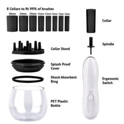 - Each set includes 8 x collars to fit different brushes, 1 x spinner, 1 x attachment spindle, 1 x shock absorbent ring, 1 x splash guard, 1 x collar stand, 1 x PET plastic bottle, 1 x user manual
