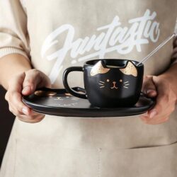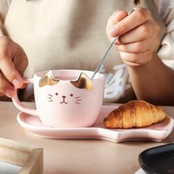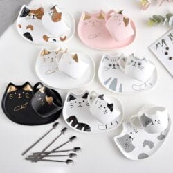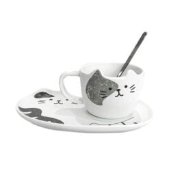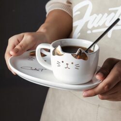 These adorable porcelain cat cup and saucer set are bound to delight your guests and fellow kitty lovers! Serve up a feline themed snack by pouring a cup of coffee or tea into kitty mug and placing your desserts on the matching serving tray!