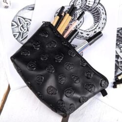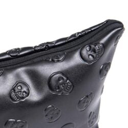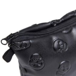 Obsessing about skulls since forever The Embossed Skull Makeup Pouch is your creepy must-have with cute little black vinyl skulls adorning it and large enough to comfortably fit your cosmetics, stationery or toiletries! All Hail the Goth Queen!