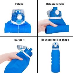 This collapsible water bottle holds a large capacity at 26oz (750ml) and folds up easily to half of its size. Wide opening makes it easy for cleaning while air return button will inflate bottle automatically, making it easy to hold and place upright when in use.