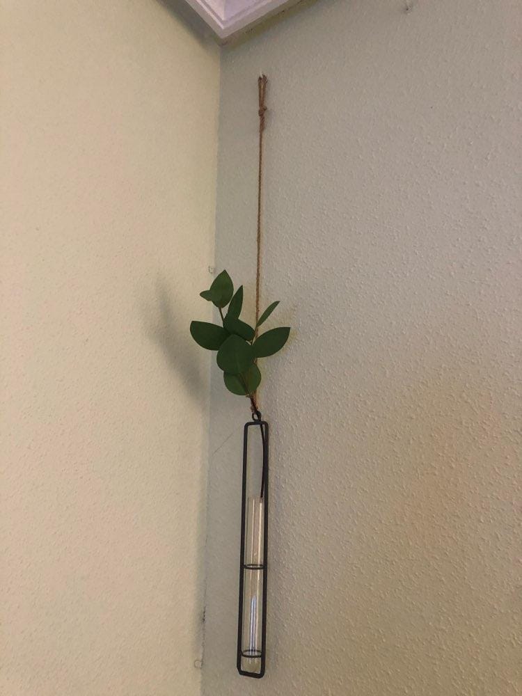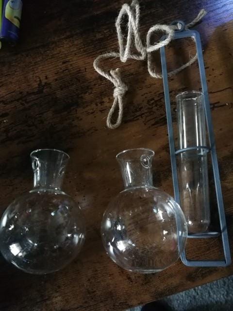- Vintage planter with glass tube vase and wrought iron hanging frame.