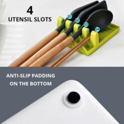 Our kitchen utensil holder with drip pad has 4 notches that allow users to rest multiple cooking tools at once and a side slot for placing your pot cover lid. Drip pad keeps counters clean from a dirty spoon, spatula or ladle.