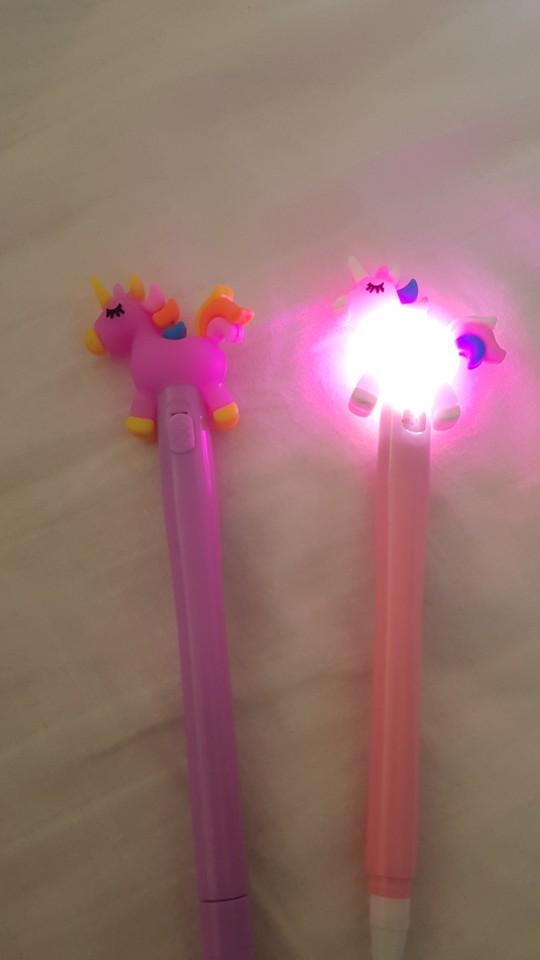 - Magical Lighted Unicorn Pen allows you to write in the dark with light emanating from its head!