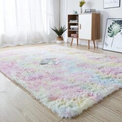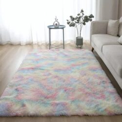 Plush Rainbow Unicorn Fur Rug can be used as a area rug, foot rug, door mat, seat cushion, baby’s mat and more! Made of dense artificial wool plush with bound edges and anti-slip bottom, the colorful plush rug is dense, fluffy and a great addition to covering up cold bare floors, decorating a girly room or sprucing up boring sofa sets!