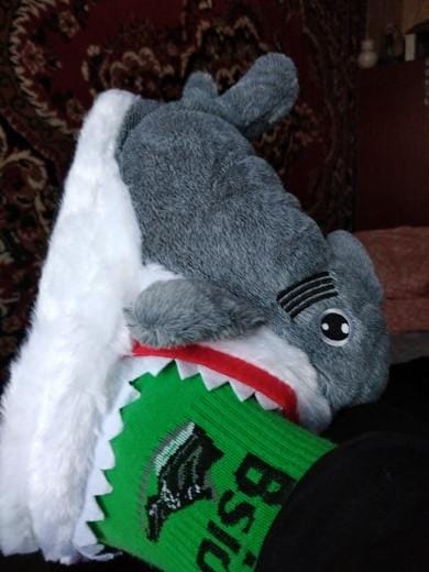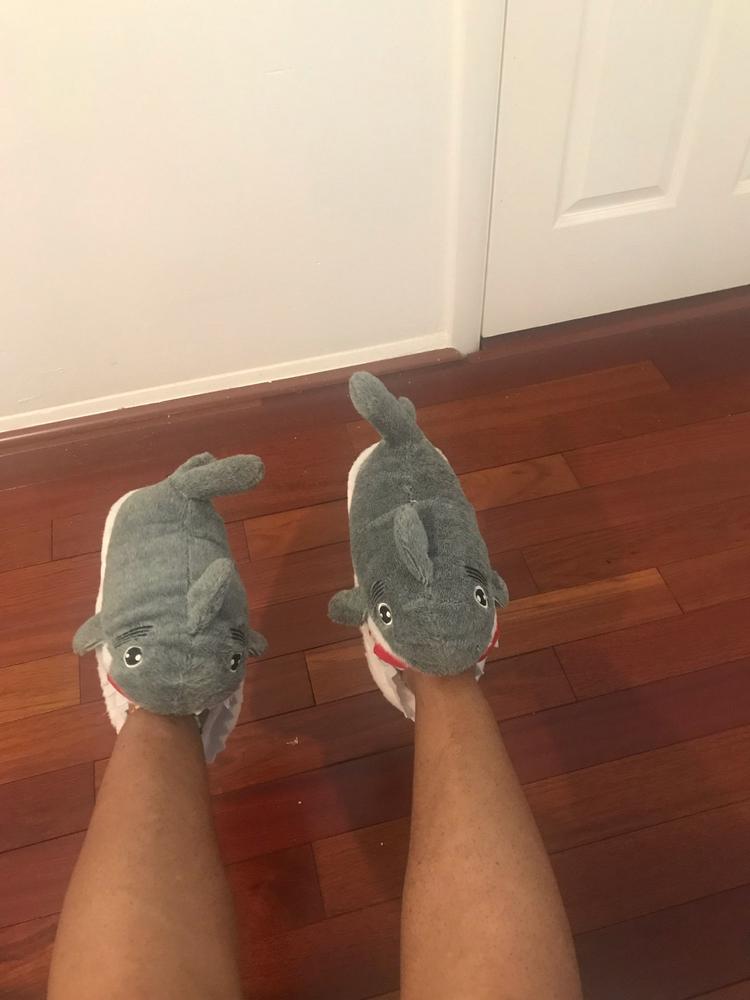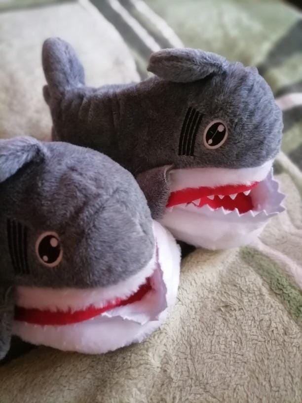 - Watch your feet get swallowed in one big gulp with the Shark Bite Plush Slippers