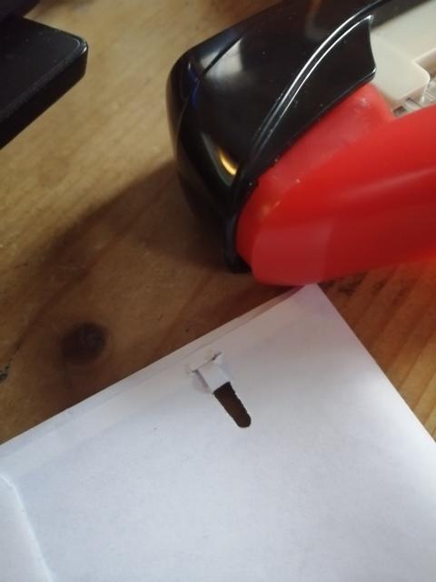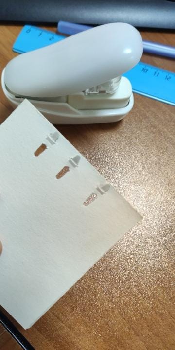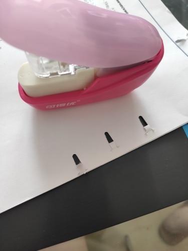 - Stapleless stapler fastens by punching a small hole in a stack of paper and tucking the punched-out tab under the bottom sheet securely.