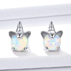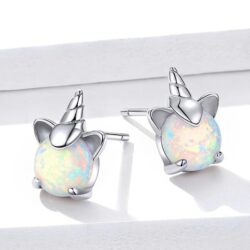 Elegant set of Sterling Silver Unicorn Opal Stud Earrings include a unique opal gemstone encased in 925 Sterling Silver unicorn horn and ears. This pair delicate and stunning earrings are sure to make heads turn when you wear them.